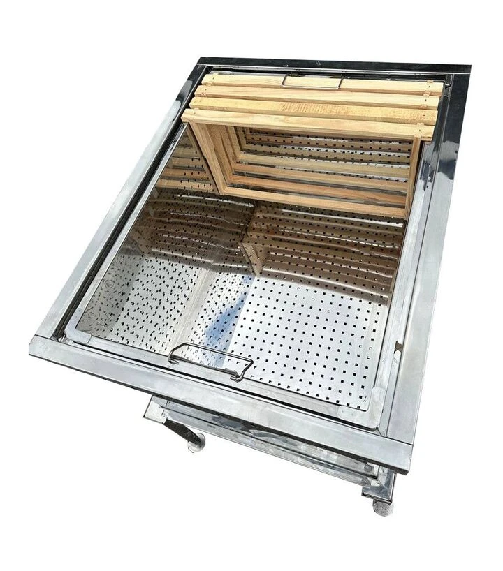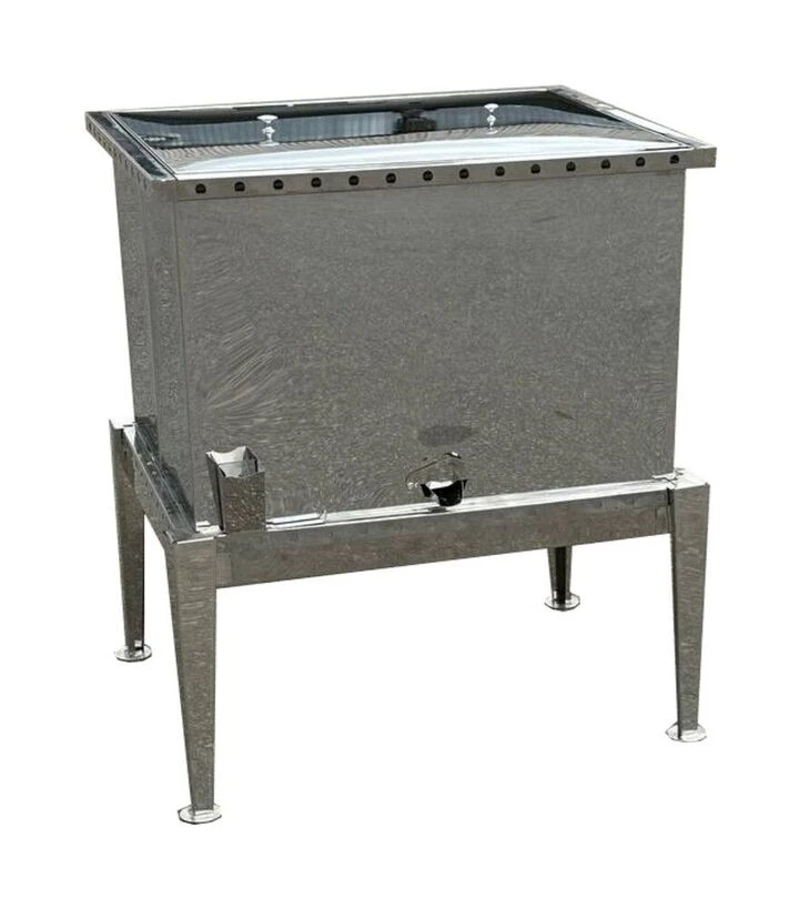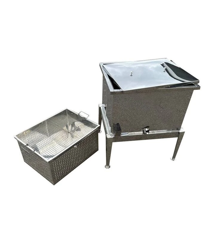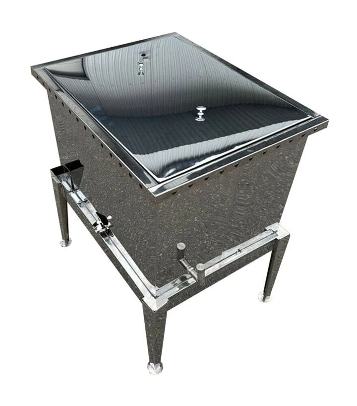 Паровая воскотопка на 15 рамок предназначена для перетапливания воска без срезания сырья с рамок, а также для переработки забруса и обрезков сотов. За один цикл можно обработать до 15 рамок Дадан, 20 рамок Рута или до 27 магазинных рамок в два яруса. Подходит также для украинских рамок. Изготовлена из пищевой нержавеющей стали AISI 304. Оснащена съемными ножками и выходом для подключения парогенератора.