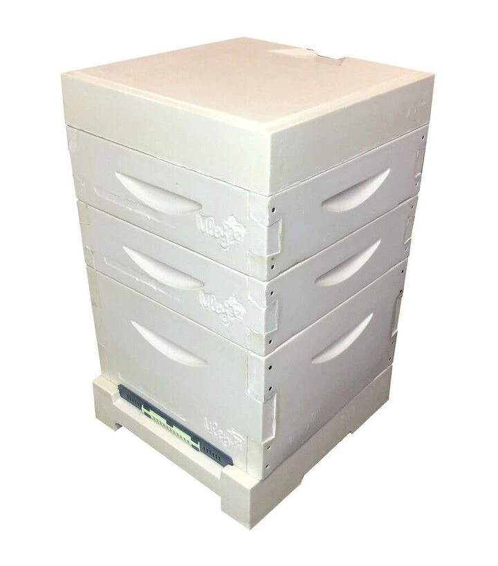 Улей из пенополиуретана под рамку Дадан 300 мм рассчитан на 12 рамок и комплектуется одним гнездовым корпусом и двумя магазинными надставками под рамку 145 мм. Все элементы изготовлены методом литья в пресс-форме, что обеспечивает точную геометрию и плотное соединение частей. Конструкция дополнена съёмным сетчатым дном и крышей ППУ, а также предусматривает возможность разделения внутреннего пространства на две пчелиные семьи.