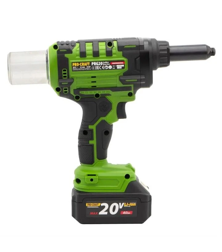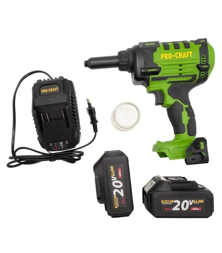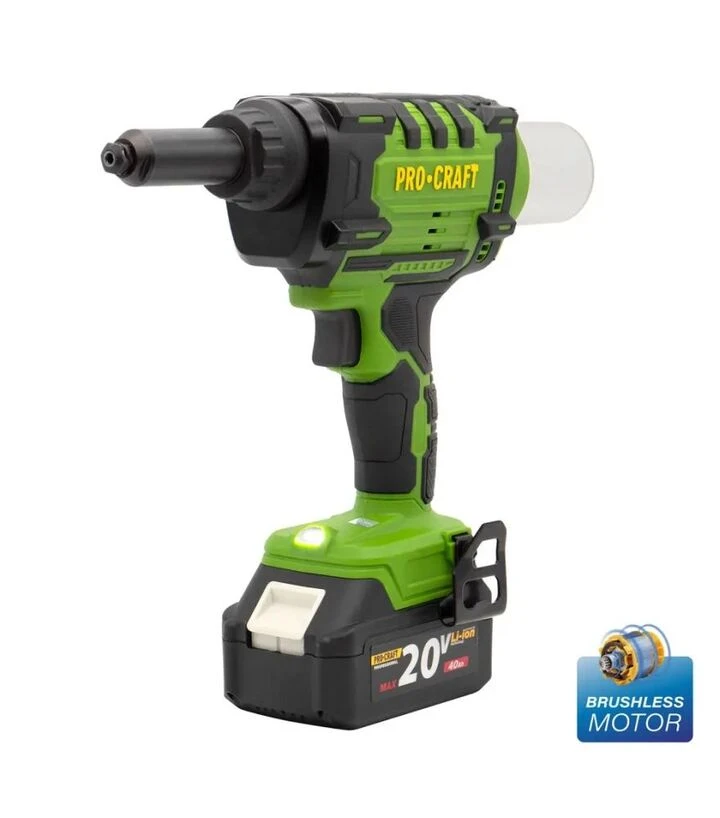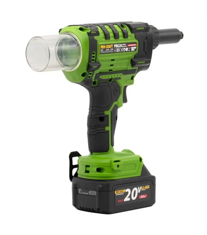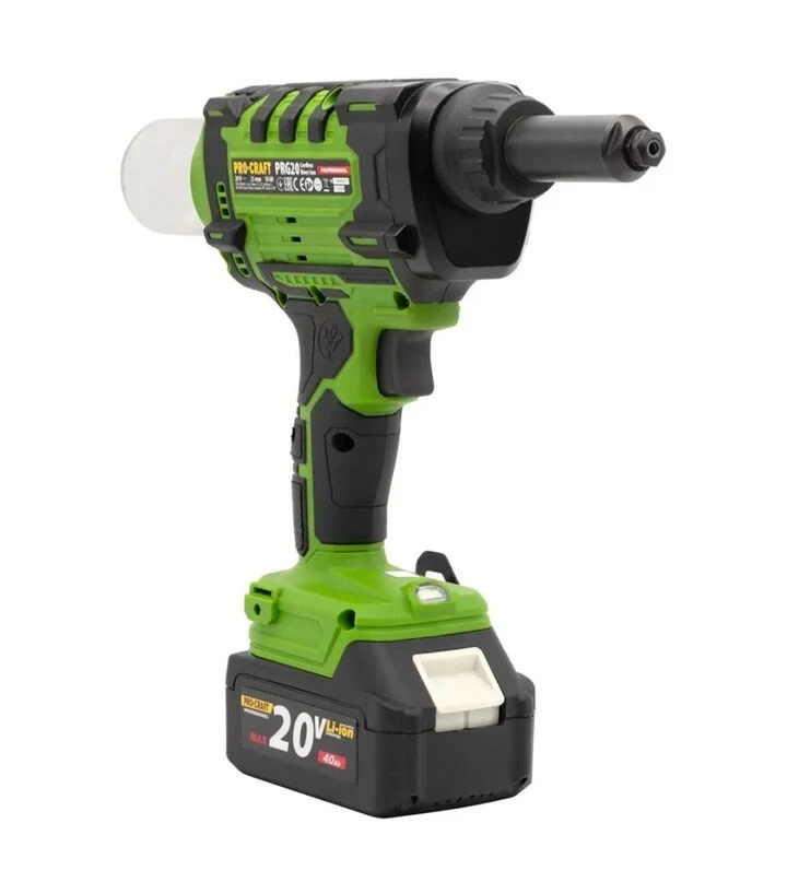 Procraft PRG-20 оснащён бесщёточным двигателем, который повышает энергоэффективность и долговечность. Аккумуляторное питание обеспечивает мобильность и независимость от электросети. Мощность 20 В позволяет работать с различными материалами и типами заклёпок.