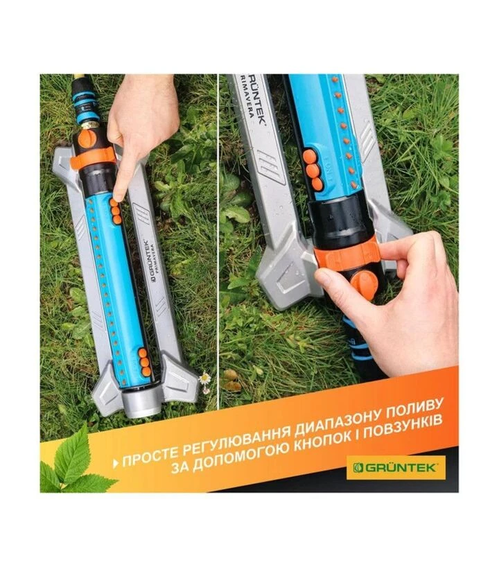 Ороситель имеет усиленный каркас с металлическими компонентами, что снижает риск повреждений. Форсунки равномерно расположены для широкого охвата, а регулировка позволяет изменять дальность и силу струи. Осциллирующий механизм обеспечивает плавное перемещение водяного потока, улучшая равномерность полива.