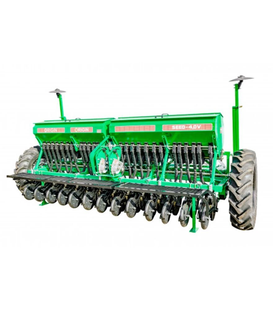 Сівалка зернотукова ORIGIN SEED 4,0-01V з пальцевим загортачем призначена для рядового висіву зернових, зернобобових і дрібнонасіннєвих культур із одночасним внесенням добрив і прикочуванням ґрунту у рядках. Агрегат підходить для висіву пшениці, ячменю, вівса, ріпаку, гороху, сої, гірчиці, нуту, люпину та інших культур. Оснащена системою регулювання норми висіву, бункерами збільшеного об’єму, двудисковими сошниками та маркерною системою. Сівалка агрегатується з тракторами потужністю від 80 к.с. і забезпечує продуктивність 3,6–4,8 га/год за ширини захвату 4 метри.