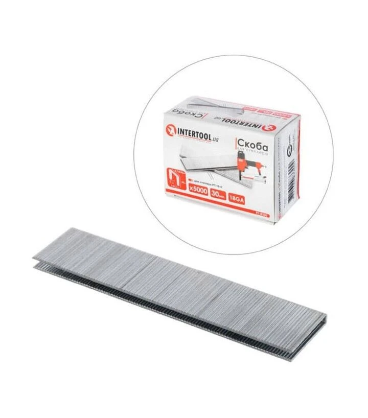 Скоба для степлера INTERTOOL PT-1612, 30 мм, 18GA, 5000 шт (PT-8330) - витратний матеріал для пневмостеплера PT-1612. Висота 30 мм, ширина 5,7 (5,8) мм і перетин дроту 1,25×1,0 мм забезпечують робоче кріплення, а упаковка 5000 штук підходить для регулярних і серійних задач.