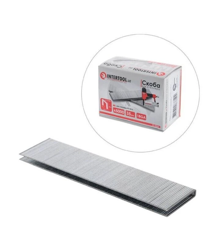 Скоба для степлера INTERTOOL PT-1612, 35 мм, 18GA, 5000 шт (PT-8335) - витратний матеріал для пневмостеплера PT-1612. Висота 35 мм, ширина 5,7 (5,8) мм і перетин дроту 1,25×1,0 мм забезпечують робоче кріплення, а формат 5000 штук підходить для регулярних і серійних задач.