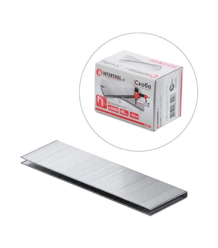 Скоба для степлера INTERTOOL PT-1612, 40 мм, 18GA, 5000 шт (PT-8340) - витратний матеріал для степлера PT-1612. Висота 40 мм, ширина 5,7 (5,8) мм і перетин дроту 1,25×1,0 мм забезпечують робоче кріплення, а упаковка 5000 штук підходить для регулярних і серійних задач.