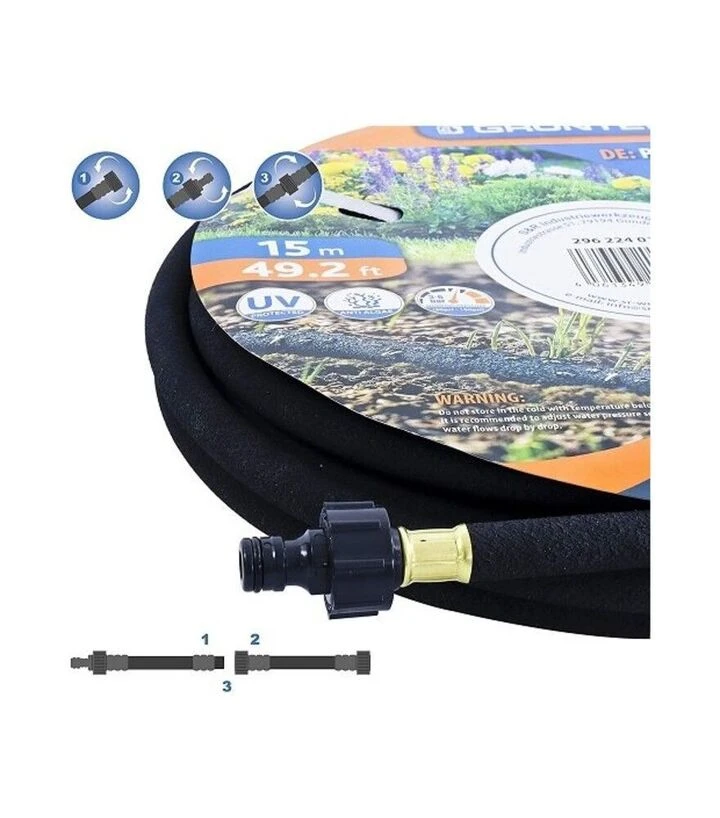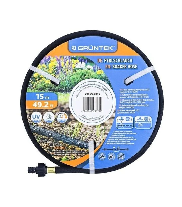 GRUNTEK емітерний шланг довжиною 15 метрів виготовлений з поєднання латексу, поліестеру та пластику. Він має стабільну витрату води 10‑15 л/год та комплектується конекторами й адаптерами для швидкого підключення до водопроводу чи магістралі.
