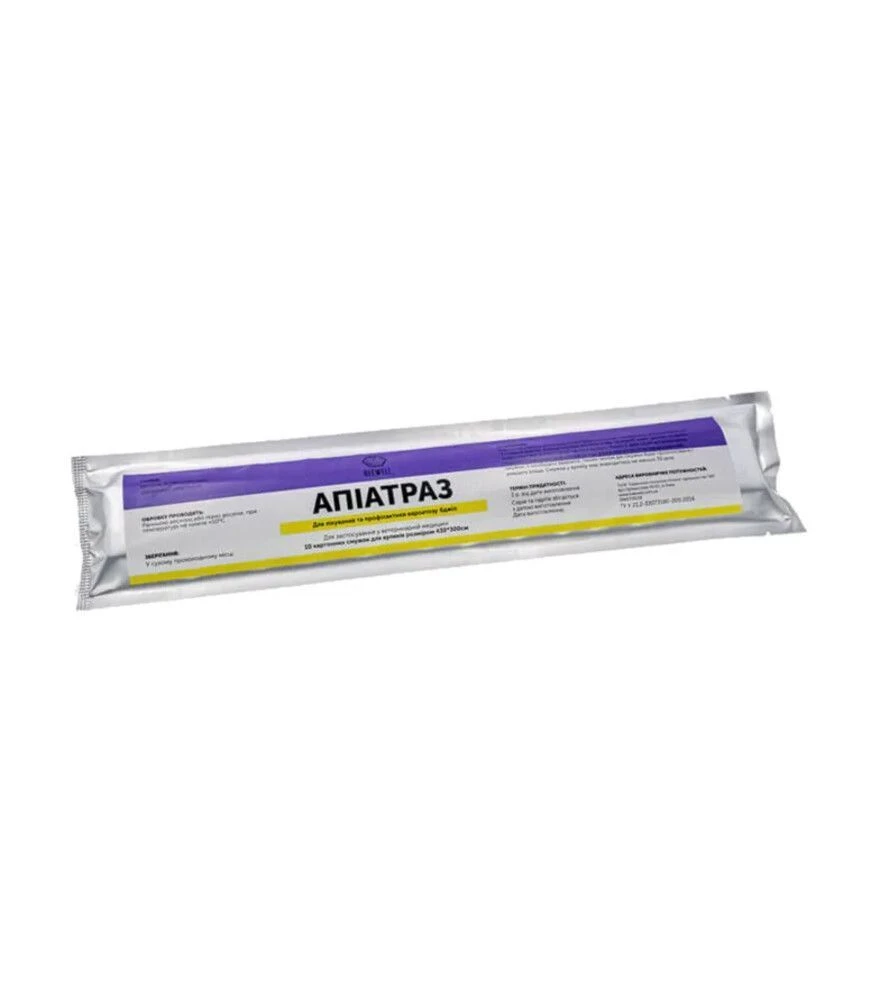 Смужки «Апіатраз» (PV0025UA) - картонні смужки з діючою речовиною амітраз для профілактики та лікування вароатозу у бджіл (кліщ Varroa destructor). Одна смужка містить амітраз 6,75 мг (допуск ±10%) та допоміжні речовини. Смужки встановлюють у розплодній частині гнізда за допомогою дерев’яних тримачів, що входять у комплект. Препарат застосовують у весняний період до початку медозбору та після медозбору для зниження закліщеності перед формуванням зимової бджоли. Використання під час медозбору не рекомендується.