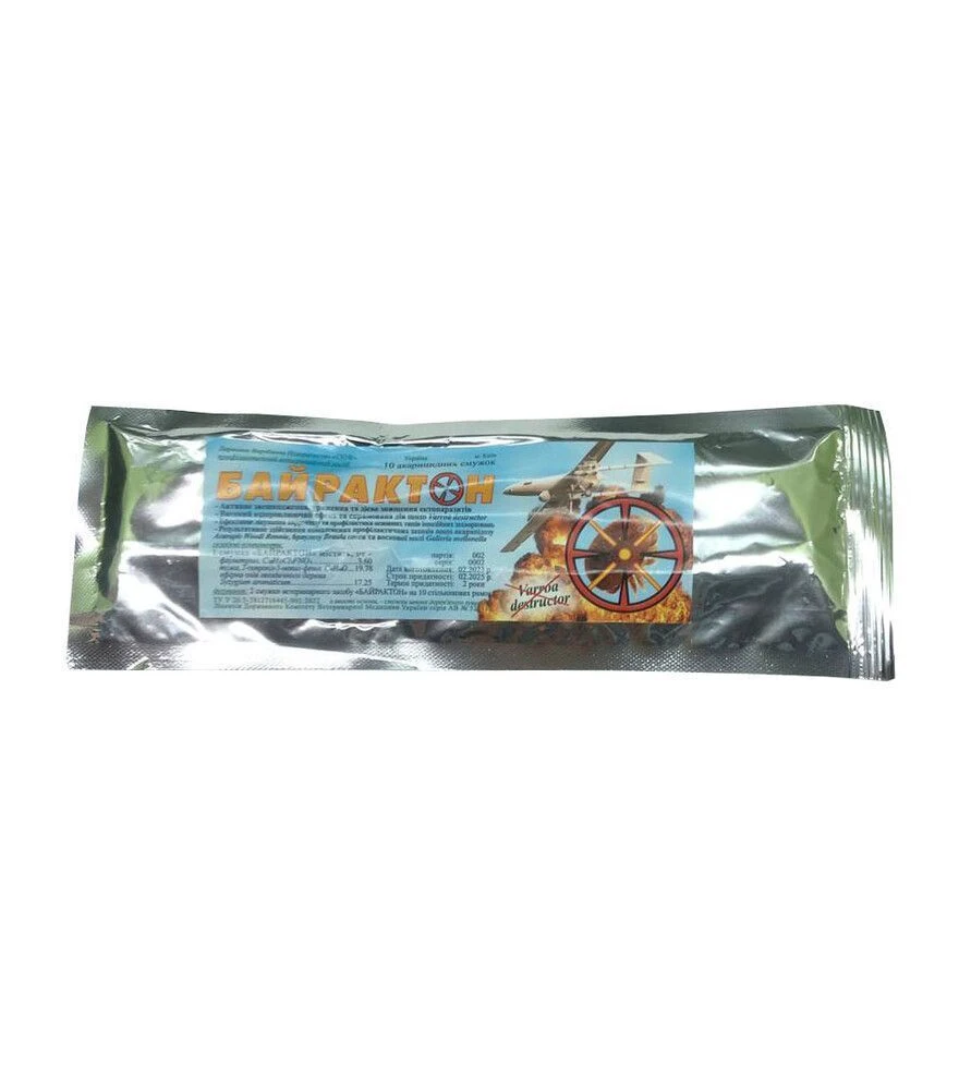 Смужки Байрактон (PV0029) - шпонова пластина з флуметрином і тимолом та ефірними оліями для лікування вароатозу й профілактики акарапідозу. Встановлюється в розплодній зоні (1–2 смужки залежно від сили сім’ї) на 3–20 діб із контролем осипу через 24 години.