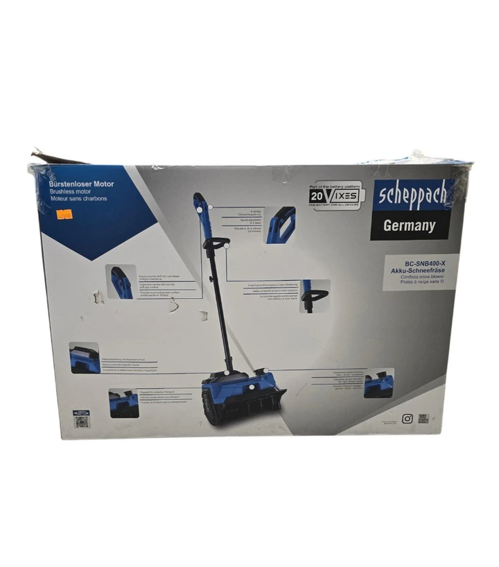 Снігоприбиральник акумуляторний Scheppach BC-SNB410-X-SetXL2 - самохідна техніка для швидкого прибирання снігу на подвір’ї, доріжках і під’їздах. Працює від акумуляторів, тож не залежить від розетки та не потребує пального. Ширина захвату 40 см і висота 20 см допомагають проходити стандартні доріжки за меншу кількість проходів, а викид снігу до 6 м дозволяє відкидати масу вбік і не повертатися до вже очищених місць.