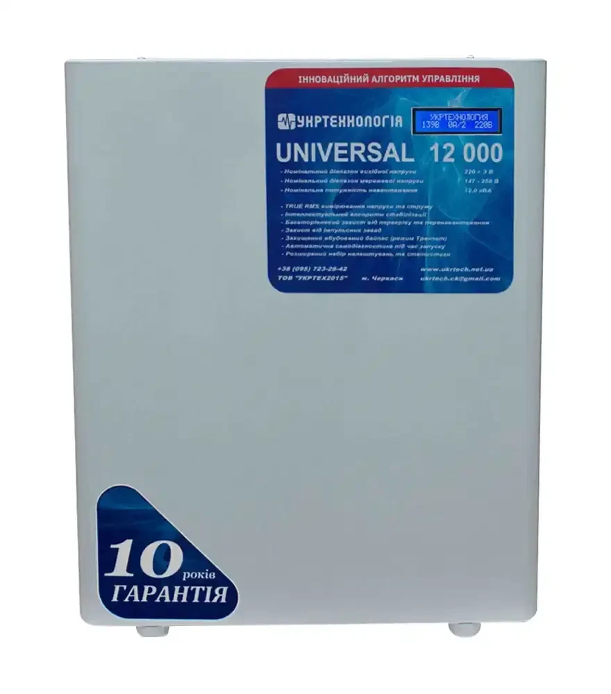 Стабілізатор напруги Укртехнологія Universal 12000 — це надійний симісторний пристрій для стабілізації електроживлення, розроблений для будинку чи офісу. З повною потужністю 12 кВт і 36 ступенями регулювання, він ефективно підтримує вихідну напругу в межах 217-223 В при вхідній напрузі від 145 до 260 В. Частота 50 Гц і затримка на перемикання 20 мс забезпечують швидку і точну реакцію на зміни вхідної напруги. Пристрій має цифровий дисплей для індикації вхідної та вихідної напруги і ступеня стабілізації, а також світлодіодні індикатори перенапруги та перегріву. Ступінь захисту IP20, система захисту від перенапруги, короткого замикання і перегріву гарантує безпеку під час експлуатації. Завдяки компактним розмірам, стабілізатор легко встановлюється в будь-якому приміщенні.