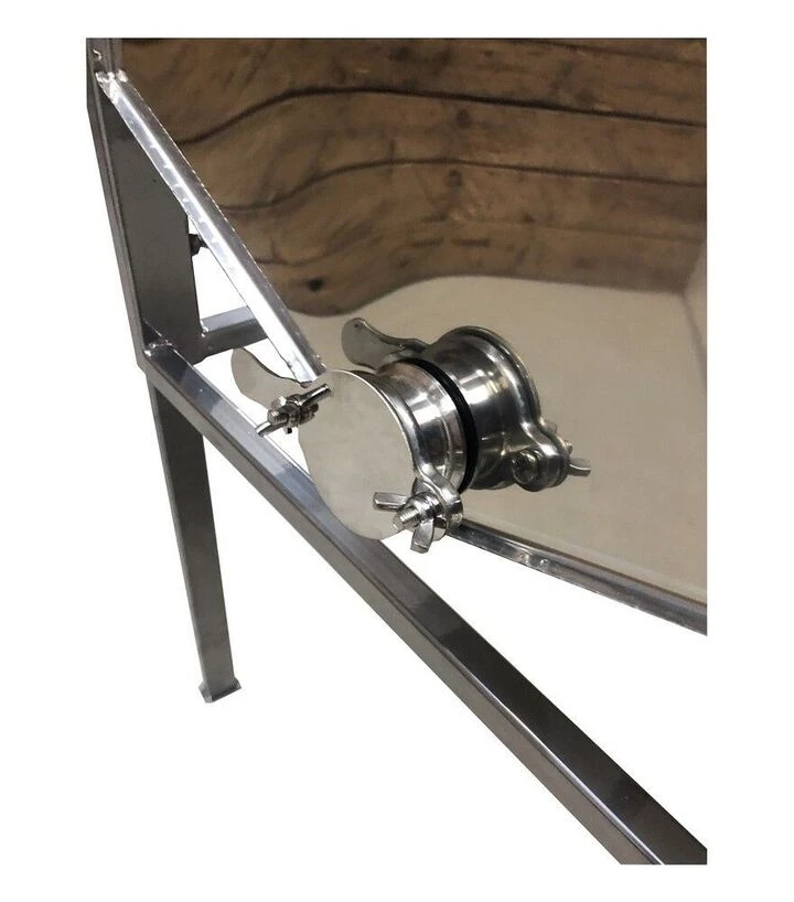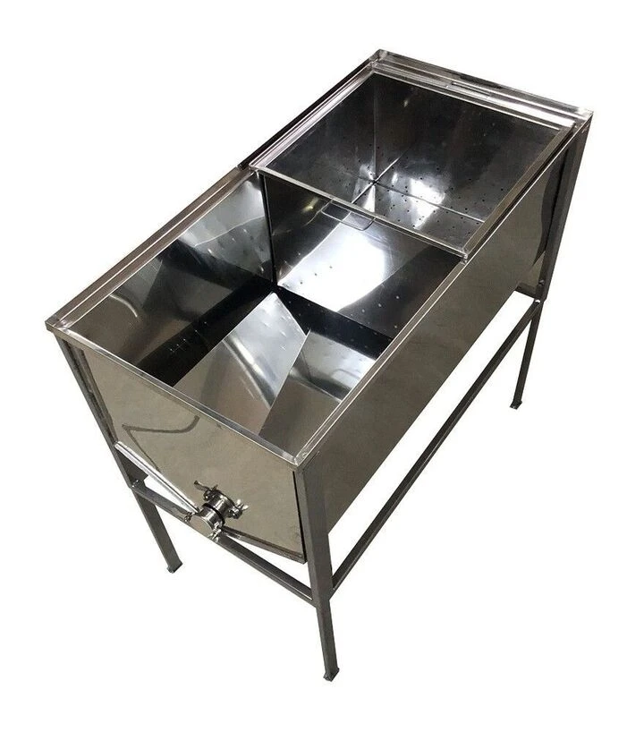 Стіл для розпечатування стільників 1 м, нержавіючий кран (1601N) призначений для організації робочого місця під час розпечатування рамок перед відкачуванням меду. Конструкція поєднує ванну з ухилом до зливу, глибокий кошик для забрусу та упор для рамки, щоб працювати ножем або вилкою було зручніше. Мед, що стікає зі зрізів і забрусу, збирається у ванні та відводиться через кран. Оновлена модель має телескопічні ніжки, що спрощує транспортування, зберігання та налаштування висоти під робоче місце. Кран виконаний з нержавіючої сталі AISI 304 для роботи з медом.