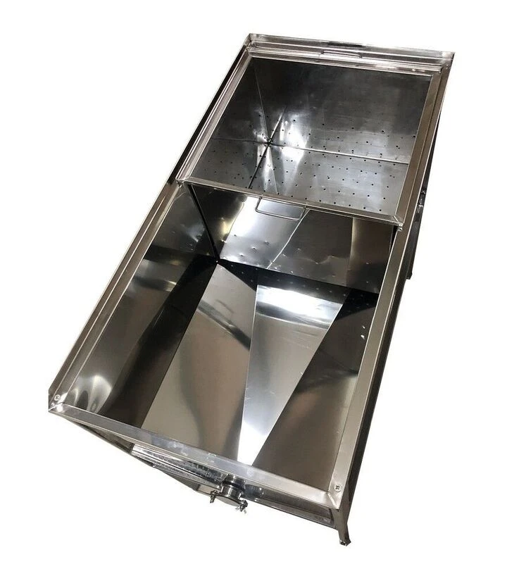 Стіл для розпечатування стільників 1 м, нержавіючий кран (1601N) поєднує ванну з ухилом, глибокий кошик для забрусу та упор для рамки. Телескопічні ніжки спрощують встановлення і зберігання, а кран з AISI 304 підходить для регулярного зливу меду під час сезону.