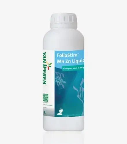 FoliaStim Mn Zn Liquid — високоефективне добриво, що містить хелатовані марганець і цинк для підсилення фотосинтетичної активності та коренеутворення. Допомагає рослинам в стресових умовах завдяки екстракту водоростей.