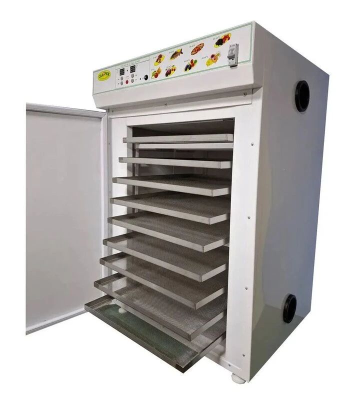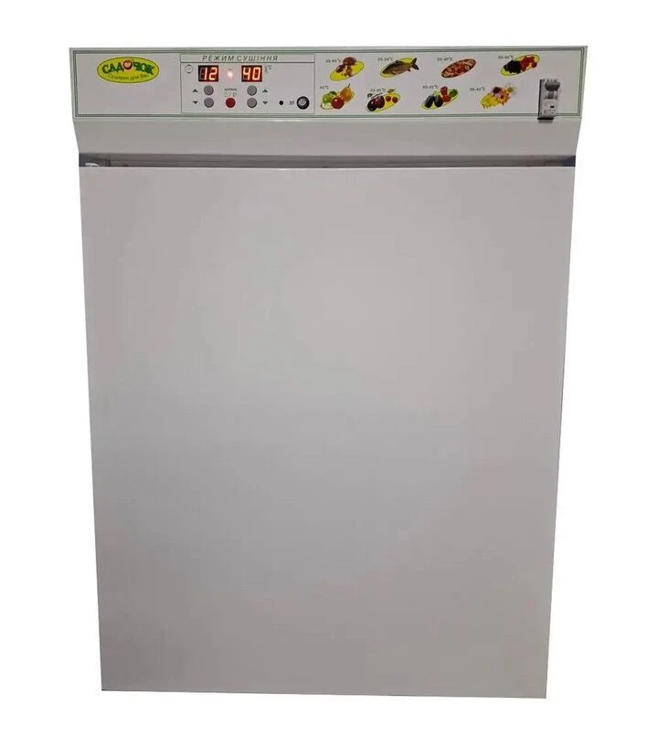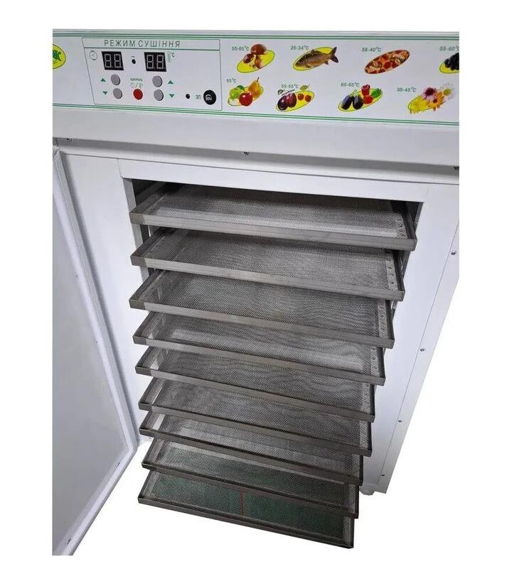 Сировину розкладають на лотках тонким шаром і встановлюють у камеру. Нагрів забезпечує оребрений ТЕН з нержавіючої сталі. Температуру задають у межах 25–65°C з кроком 2°C, а тривалість сушіння - від 1 до 40 годин з інтервалом 1 година. Повітря проходить через сітку лотків і виводить вологу з продукту протягом усього циклу.