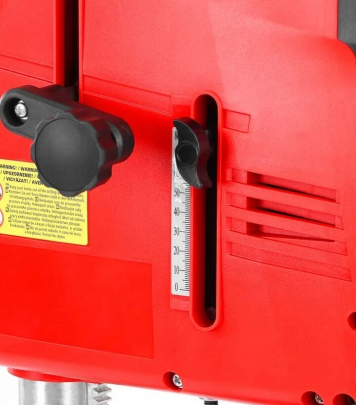 Конструкція HECHT 1057 передбачає можливість регулювання швидкості обертання шпинделя в діапазоні 500–2600 об/хв. Така функція дає змогу адаптувати швидкість під конкретний матеріал та діаметр свердла: низькі оберти використовуються для твердих матеріалів та великих діаметрів, тоді як великі оберти - для легких, м’яких матеріалів і швидкого свердління. Хід шпинделя становить 80 мм, що забезпечує достатню глибину свердління за один прохід без потреби у багаторазових рухах або змінах положення заготовки. Це робить верстат придатним навіть для складніших задач, які потребують точності та рівномірності виконаних отворів.