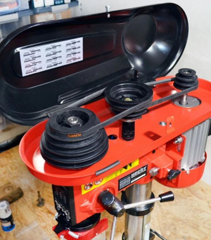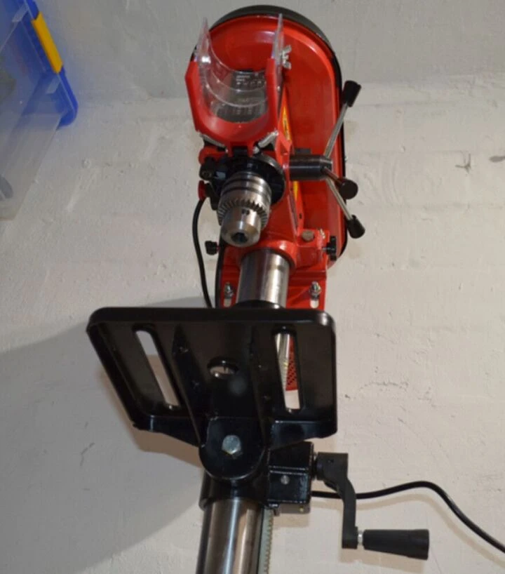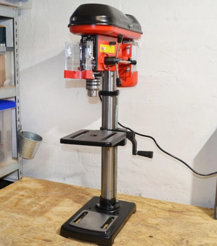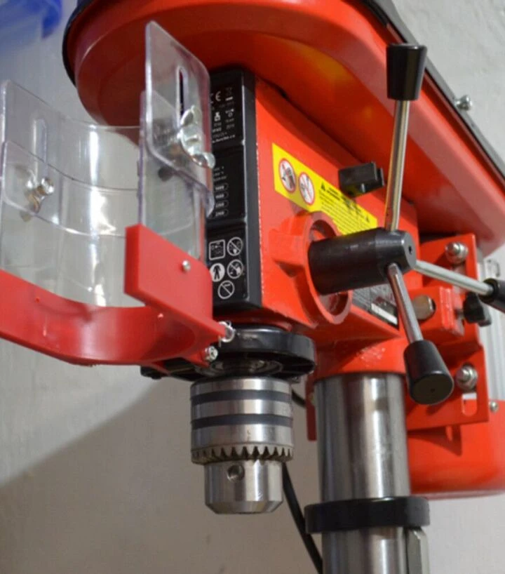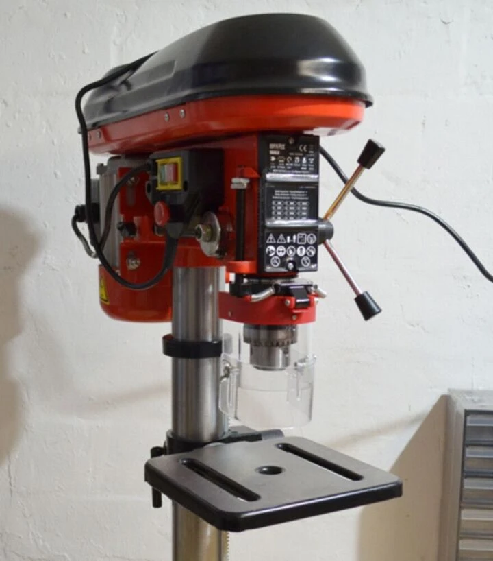 Ця модель обладнана регульованою швидкістю обертання в діапазоні від 420 до 2700 об/хв, що дозволяє адаптувати режим свердління залежно від матеріалу і діаметра свердла. Низькі швидкості доцільні для роботи з твердими металами та великими свердлами, тоді як вищі - для швидкого свердління у м’яких матеріалах, деревині або пластику. Такий діапазон забезпечує гнучкість у роботі та дозволяє оптимально підібрати режими для конкретних задач. Свердлильний стіл розміром 195×195 мм забезпечує достатню площу для надійної фіксації заготовки, а його нахил до 45° дозволяє виконувати свердлильні операції під кутом, що робить інструмент більш універсальним і зручним у використанні для різних технологічних процесів.