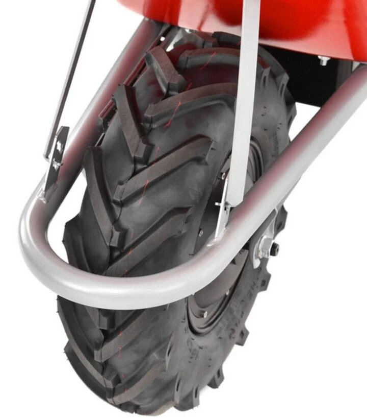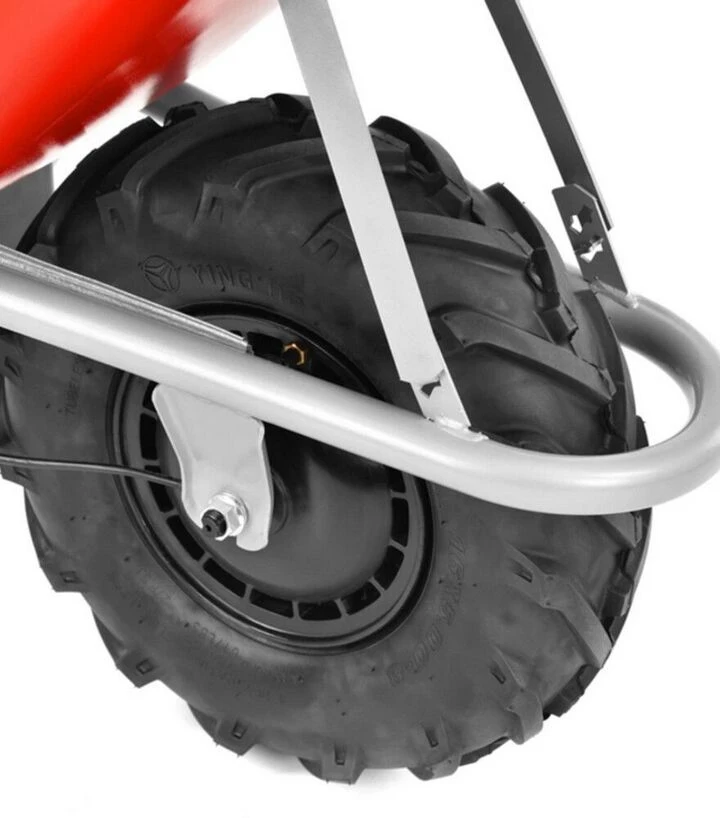 Ця модель має одну велику колесо діаметром 20 см, що полегшує рух по грунту, газону або доріжках у саду. Одинарне колесо робить конструкцію компактною, що зручно при маневруванні у вузьких ділянках або при роботі в місцях з обмеженим простором. Ергономічні рукояті дозволяють однаково комфортно управляти тачкою як правою, так і лівою рукою, а мотор забезпечує підтримку руху навіть під навантаженням. При наповненому кузові рух залишається плавним, а електродвигун підтримує обрану швидкість, що знімає частину навантаження з користувача та зменшує необхідність фізичних зусиль при перевезенні.