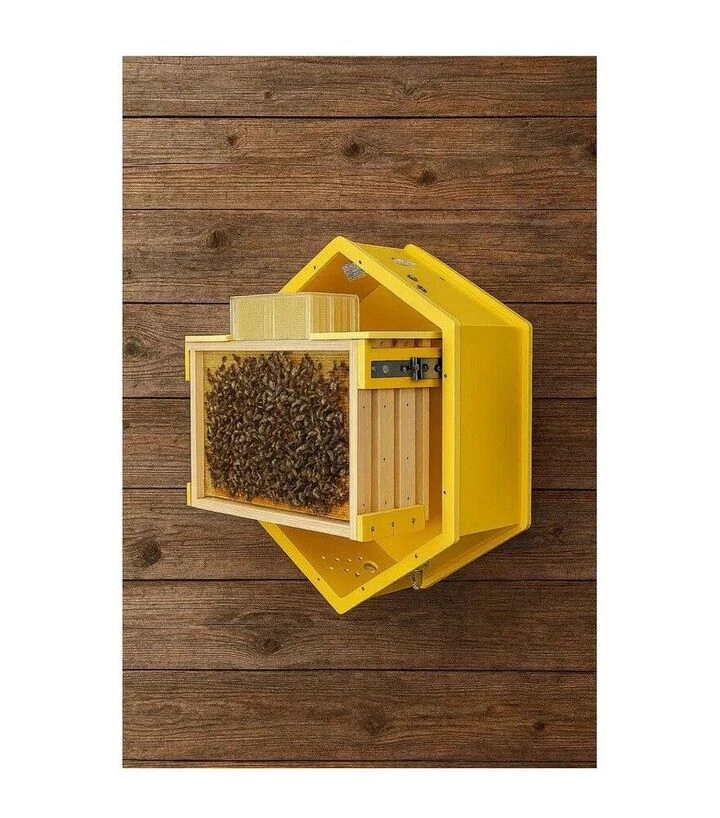 Бджоли живуть у прозорому акриловому корпусі, а для виходу назовні використовується труба. Гніздо формується на 3 рамках, а для стільникового меду встановлюються 6 мінірамок з вощиною. Фіксатори та заслінки допомагають утримувати рамки на місці, заставна дошка обмежує об’єм усередині.