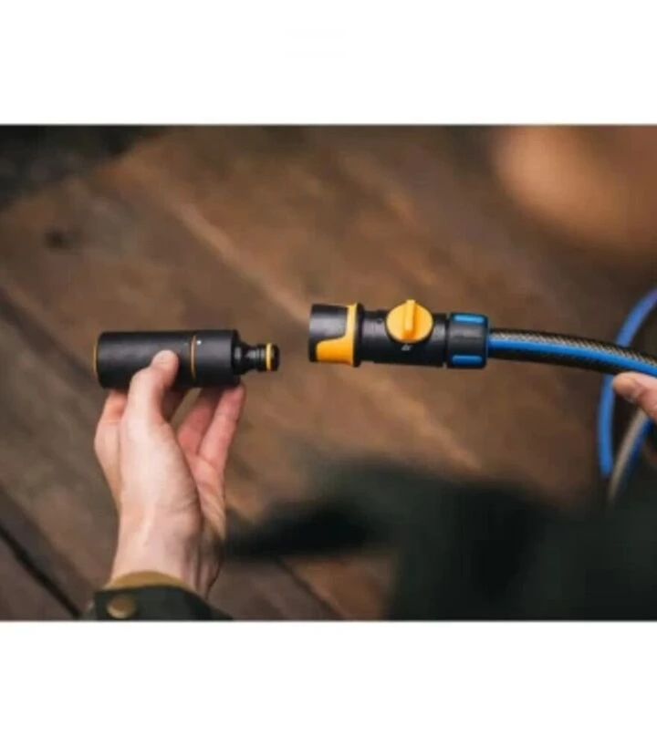 Конектор встановлюють на кінець шланга та з’єднують із поливальним інструментом. Вбудований клапан On/Off дозволяє швидко перекривати подачу води або відновлювати її рух, що робить заміну насадок та пристроїв простішою. Клапан знижує тиск у шлангу під час перемикання, тому під’єднання та від’єднання інструментів відбувається плавно.