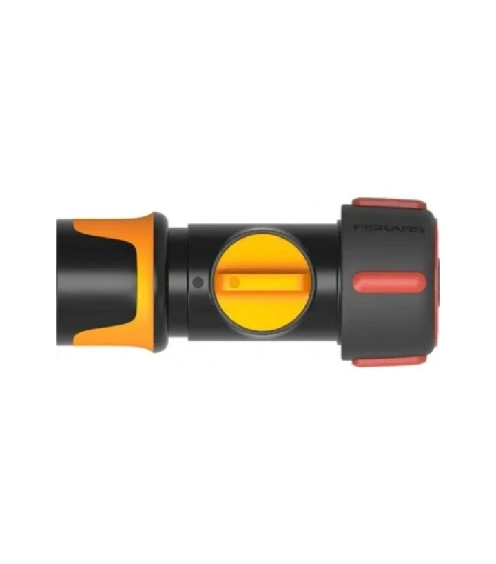 Конектор для шланга Fiskars з механізмом ВКЛ/ВИМК 19 мм - практичний елемент системи поливу, що дозволяє контролювати подачу води прямо на шлангу та швидко змінювати поливальні насадки під час роботи.