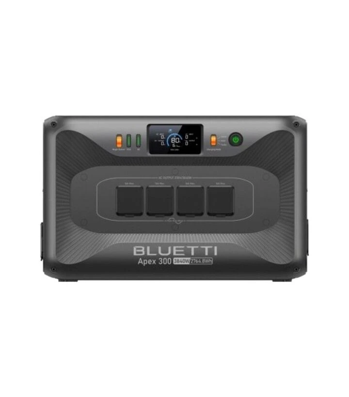 Зарядна станція BLUETTI Apex 300, 3,84 кВт, 2764,8 Вт*год BLUETTI Apex 300 - це потужна портативна зарядна станція, створена для автономного живлення побутових приладів, інструментів, техніки та електроніки в умовах, де немає стаціонарної електромережі. Вона має номінальну вихідну потужність до 3,84 кВт і акумуляторну ємність 2764,8 Вт*год на базі LiFePO4‑батареї з ресурсом до 6000 циклів заряджання. Це дозволяє довго використовувати станцію без істотного зниження ефективності. Apex 300 забезпечує вихідну напругу 230 В, частоту 50–60 Гц і підтримує зарядку від стаціонарної мережі, сонячної панелі або автомобільного прикурювача - це робить її універсальним рішенням як для побутових задач, так і для роботи в полі чи виїзних умовах. Модель обладнана ширшим набором виходів для підключення техніки: чотири змінного струму (AC) - для побутових приладів, насосів, інструментів; два автомобільні виходи - для живлення обладнання 12 В; і додаткові порти для зарядки мобільних пристроїв. Така комплектація дозволяє одночасно підключати і живити різне електричне обладнання без використання перехідників або додаткового обладнання.