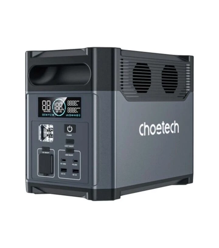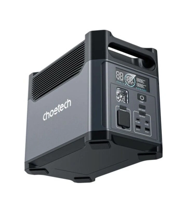 Зарядна станція Choetech BS0061, 1,2 кВт, 1024 Вт*год Choetech BS0061 - це портативна зарядна станція з номінальною потужністю до 1,2 кВт і ємністю акумулятора 1024 Вт*год, яка створена для автономного живлення побутових приладів, електроніки та невеликих інструментів у польових умовах, на дачі або як резервне джерело живлення при вимкненнях електрики. Акумулятор LiFePO4 розрахований на до 3500 повних циклів заряджання, що дозволяє довго використовувати станцію без істотної втрати ємності. BS0061 підтримує заряджання від трьох джерел: від мережі, від сонячної панелі та від автомобільного прикурювача - це робить її універсальною для різних сценаріїв роботи. Станція оснащена зручним набором виходів: дві розетки змінного струму (AC) для підключення побутової техніки або освітлення, два порти USB Type‑C та два USB Type‑A для зарядки смартфонів, планшетів, навігаторів і іншої портативної техніки, а також вихід XT60, який дозволяє підключати обладнання зі спеціальними вимогами живлення. Наявність різних портів дає змогу одночасно підключати кілька пристроїв без додаткових адаптерів.