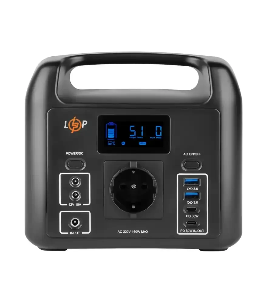 LP CHARGER 160 — багатофункціональна портативна зарядна станція ємністю 160 Вт для швидкого заряджання мобільних пристроїв та побутових приладів. Вона оснащена місткою акумуляторною батареєю LiFePO4, що забезпечує заряджання для телефонів, планшетів, дронів та інших пристроїв. Потужний інвертор забезпечує резервне живлення електрообладнання від джерела змінного струму (AC220V). Заряджання акумулятора може здійснюватися від сонячної панелі (7-8 год), розетки змінного струму (приблизно 7 год) або автомобільної зарядки (до 15 год). LP CHARGER 160 використовується для заряджання пристроїв під час походів, риболовлі, пікніків тощо. Батарея витримує до 2000 циклів заряджання, що гарантує тривалу роботу пристрою. Універсальні багатофункціональні зарядні станції, як LP CHARGER 160, здатні локально мінімізувати наслідки відключення електроенергії, забезпечуючи стабільне живлення для різних потреб.