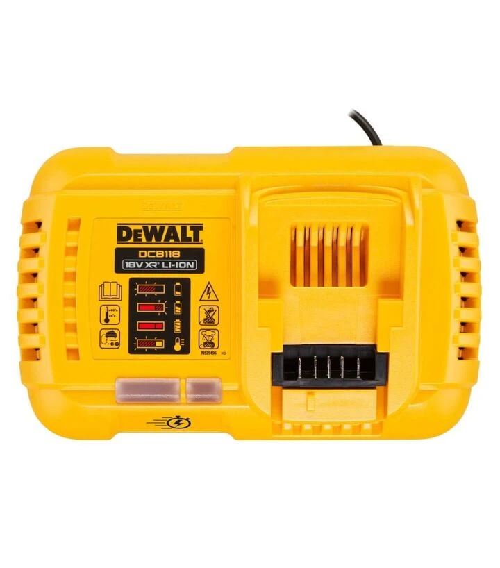 DeWALT DCB118 -надійний і гнучкий зарядний пристрій, що підтримує сучасні системи XR та FLEXVOLT, адаптуючись під батареї та забезпечуючи їм захист і ефективність.