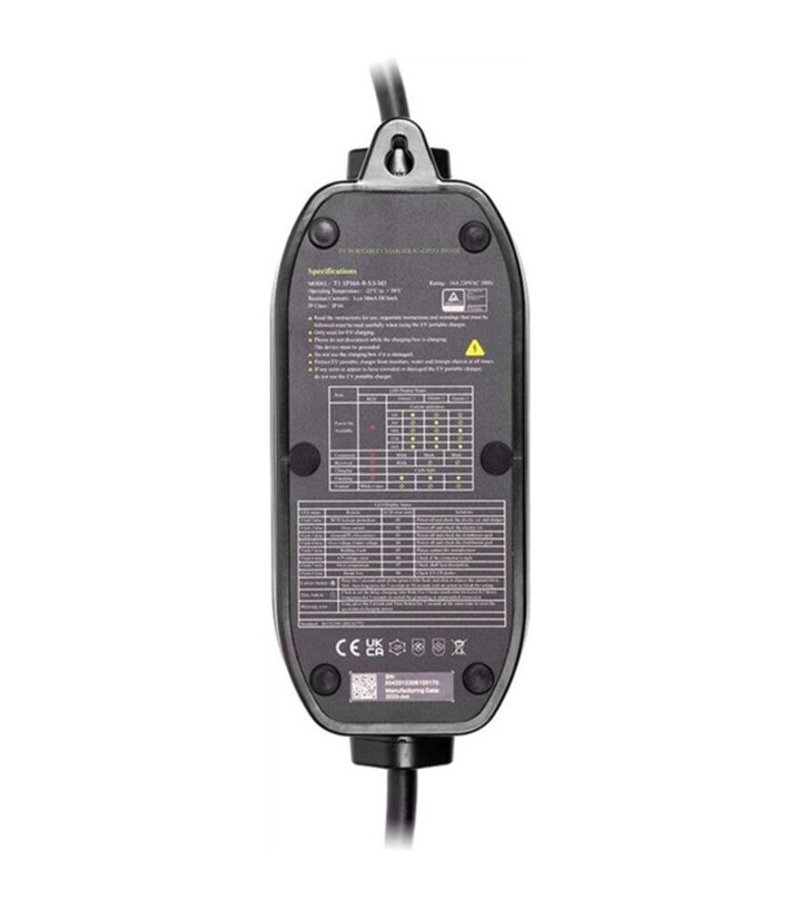 Пристрій використовує вхідну вилку Schuko 16 А та вихідну EV-вилку GB/T 20234 із сімома контактами. Кабель 3x2,5 мм² + 1x0,75 мм² відповідає стандарту EN50620. Корпус чорного кольору з класом захисту IP66 працює в діапазоні температур від -25°C до +50°C при вологості до 95% без конденсації. Модель сертифікована за стандартом CE.