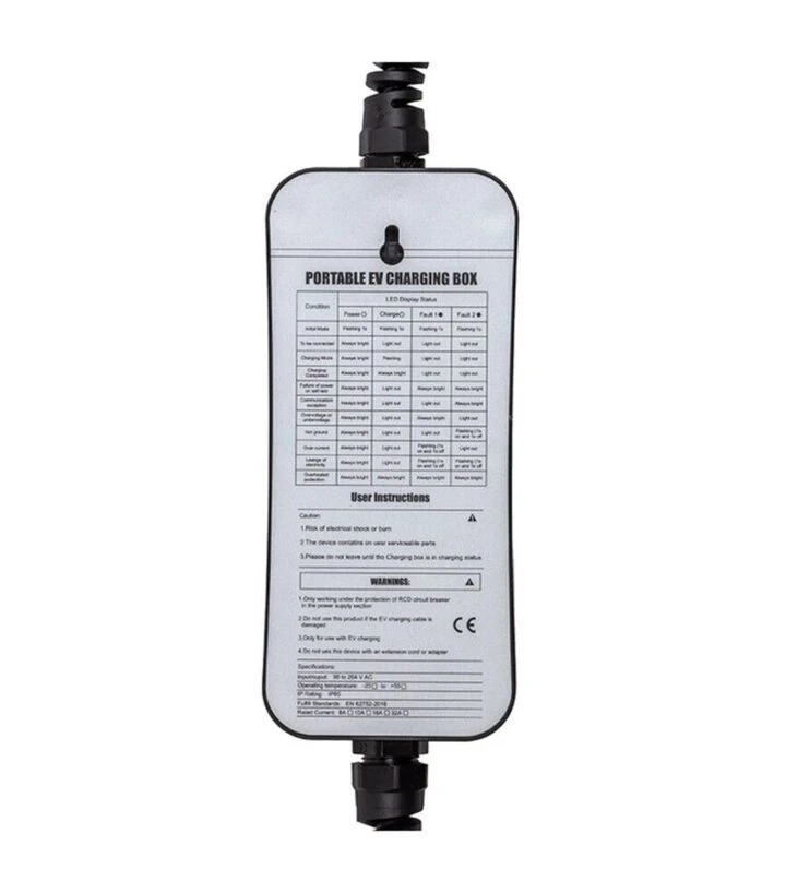 Пристрій використовує конектор SAE J1772 Type 1 з п’ятьма контактами та роз’єм Schuko на 16 А із класом захисту IP44. Конфігурація кабелю 3×14 AWG + 1×18 AWG розрахована на заявлене навантаження. Корпус і розміри 330×330×70 мм дозволяють компактне розміщення, а вага близько 1,9 кг робить пристрій зручним для щоденного перевезення разом з автомобілем.