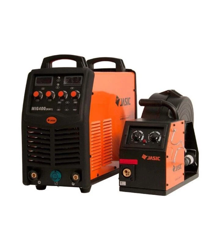 Jasic MIG-400 (MIG.N361/MIG.N361FS.A1) має напругу холостого ходу 62 В і швидкість подачі дроту 1–21 м/хв. Габарити 760×360×585 мм і вага 41 кг підходять для стаціонарного монтажу або встановлення на візок. Апарат розрахований на роботу в приміщенні при температурі від -5 до +40 °C від промислової трифазної мережі 380 В.